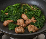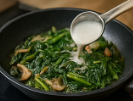 - 팬에 올리브유·마늘을 두르고 향을 낸 뒤 버섯·눈개승마를 2분 볶습니다.