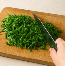 - 데치기 : 준비한 나물 200 g을 위 방법으로 살짝 데쳐 물기 꼭 짜기.