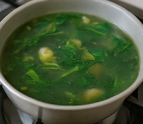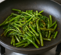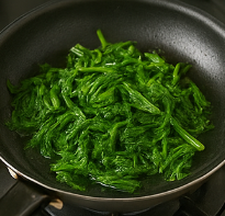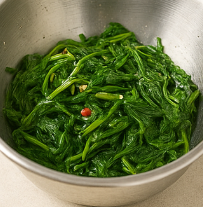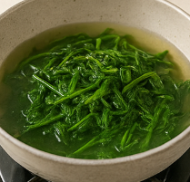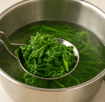 • 데치기: 끓는 물에 굵은소금 0.5 T, 잎 나물 30초·줄기 나물 60 초 후 즉시 얼음물