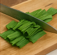 1. 1공기에 깨소금 ½T, 참기름 1t, 잘게 썬 잎 2줄기를 넣어 고루 섞는다.