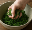 - 장갑을 끼고 잎이 부서지지 않도록 20회 가볍게 주물러 양념을 스며들게 합니다.