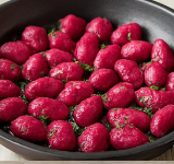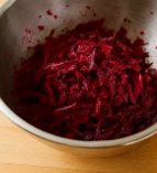- 찐 비트를 1 cm 주사위 형태로 자르고, 시금치·루콜라 손질 잎 50g을 볼에 담습니다.