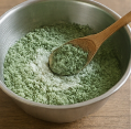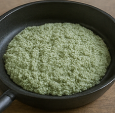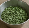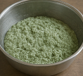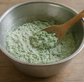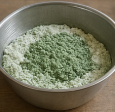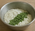 - 데친 쑥을 1 cm 길이로 잘라 반죽과 골고루 섞은 뒤, 체에 내려 고운 입자를 만든다.