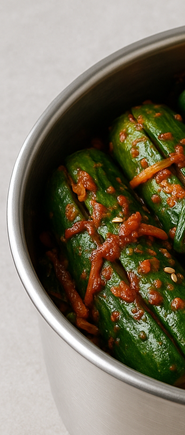 - 2차 숙성 – 밀폐용기에 오이를 켜켜이 담고 남은 양념을 위에 얹어 공기를 차단합니다. 실온 20 ℃에서 6시간 두면 산뜻한 향이 올라오고, 이후 냉장 4 ℃에서 24시간 숙성하면 가장 아삭합니다. 이 타이밍을 놓치면 과숙 발효로 국물이 탁해지니 알람을 맞춰 두세요.