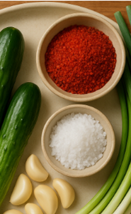- 오이 선택 – 씨가 촘촘하고 껍질에 미세 돌기가 살아 있는 다다기오이가 최적입니다. 길이 18 cm 안팎, 굵기 3 cm 전후가 속을 채우기 좋고, 수확 3일 이내의 신선한 상품이면 절임 과정에서 물 빠짐이 고루 진행됩니다.