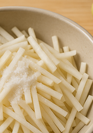 길이 5~6cm 토막 후 2~3mm 두께로 채 써는 게 기본입니다. 너무 두꺼우면 양념이 겉돌고, 너무 얇으면 숨이 빨리 죽죠. 굵은소금은 무 무게의 0.7~1%(1kg 기준 7~10g)만 뿌려 10~15분 정도 가볍게 절입니다. 저는 주로 12분을 기준으로 두고, 계절과 무 상태에 따라 2분 정도만 가감합니다. 절인 뒤에는 헹구지 말고 채반에서 물기만 살짝 털어 주세요. 절임 시간을 지키는 것만으로도 무생채 맛있게 하는법 의 실패 확률이 크게 줄었다.